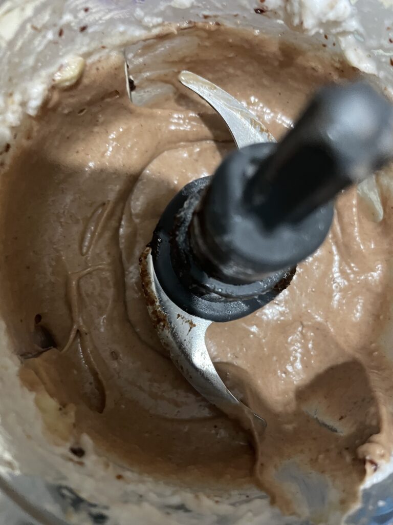 Πολτοποιήστε σε μπλέντερ τη μπανάνα, την κρέμα καρύδας, το βούτυρο φουντουκιού και την κρέμα χουρμα με κακάο. Αν δεν βρείτε κρέμα χουρμά με κακάο, προσθέστε κακάο σταδιακά ανά μια μεγάλη κουταλιά και αφού χτυπήσετε λίγο στο μπλέντερ δοκιμάστε αν είναι ικανοποιητική η γεύση.
