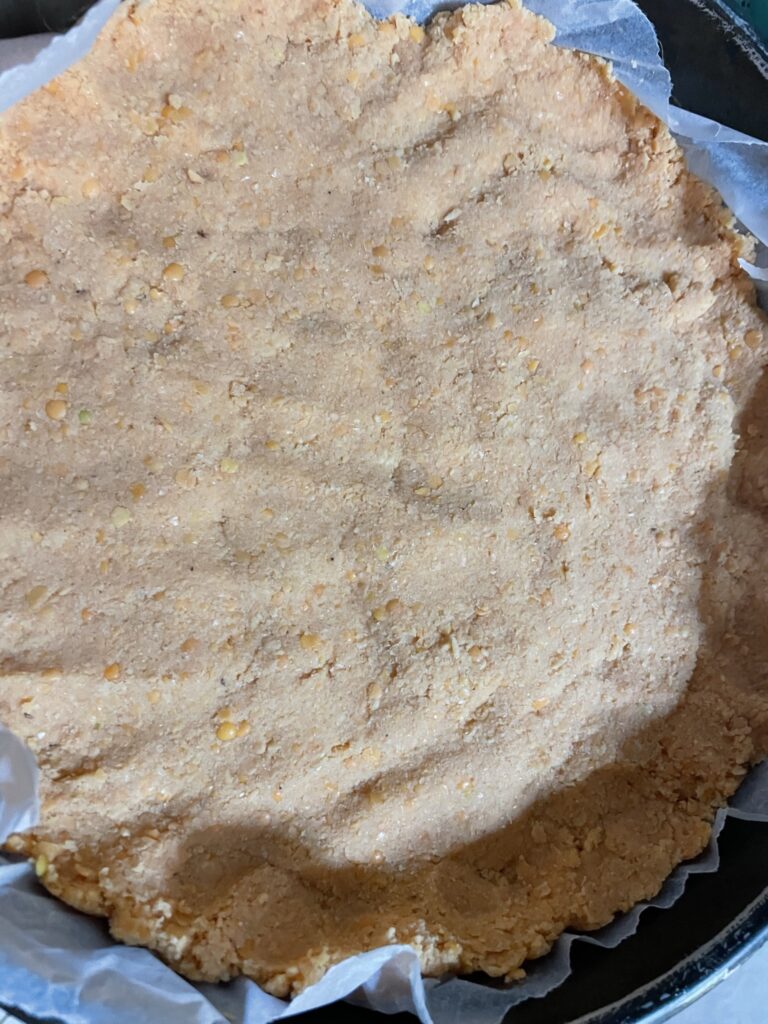 Σε ένα ταψί στρόγγυλο μεσαίου μεγέθους βάζουμε μια λαδόκολλά και επάνω αδειάζουμε τη ζύμη μας την οποία απλώνουμε ομοιόμορφα μέχρι τα τοιχώματα του ταψιού. Μπορούμε να πιέσουμε στα τοιχώματα να σχηματίσει ύψος και στην υπόλοιπη επιφάνεια να είναι πιο λεπτή. Πιέστε αρκετά τη ζύμη να κάτσει ομοιόμορφα. Θα δείτε ότι καθώς πιέζεται μέσα στο ταψί, γίνεται όλο και πιο πυκνή και στεγνή.