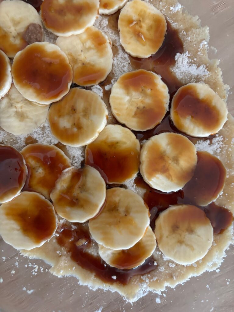 Ρίξτε στο σκεύος που θα μείνει το γλυκό 1 πακέτο αλεύρι αμυγδάλου και τη βανίλια, ανακατέψτε και ρίξτε μισό φλιτζάνι νερό αργά αργά. Η βάση θέλετε να είναι σχετικά σφιχτή να έχει υφή τάρτας. Το αλεύρι αμυγδάλου είναι ουσιαστικά αμύγδαλο τριμμένο, δεν θέλετε να γίνει αραιό καθώς δε θα ψήσουμε το γλύκισμα για να στεγνώσει. Απλώστε το ομοιόμορφα στο σκεύος και στρώστε από πάνω ροδέλες μπανάνας. Ρίξτε σιρόπι χουρμά όσο θέλετε ανάλογα με το πόσο γλυκό το θέλετε.
